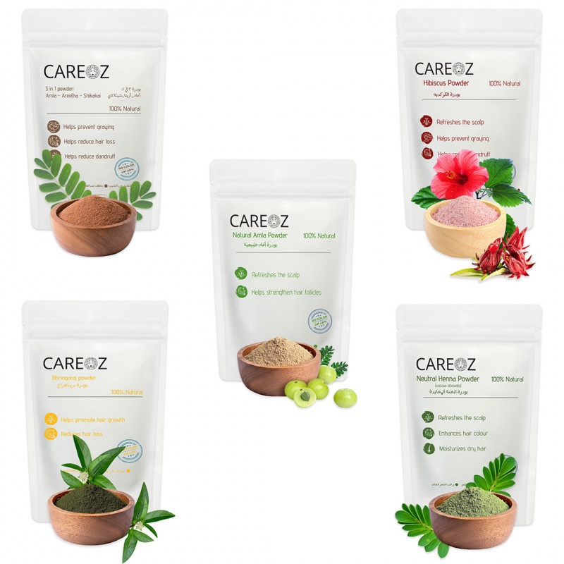 مجموعة العناية المتكاملة للشعر تقدم لك حلاً شاملاً وطبيعيًا للعناية بشعرك. تحتوي هذه المجموعة على عدة أنواع من البودرة الطبيعية المستخلصة من أعشاب ونباتات هندية 100%، لضمان تقديم أفضل الفوائد لشعرك دون أي مواد كيميائية أو أصباغ صناعية.